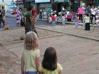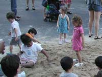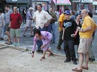 In Pétanque, players attempt to throw a heavy ball so it arrives closer to the target smaller ball than one's opponent. Its basic rules are similar to Italian Bocci and it is usually played on a sandy field, not a commonplace feature in a downtown Brooklyn neighborhood, hence the need for the front-end loader and lots of shovels. Old time players mustered up some decent competitions while also showing the novices how the game should be played. And as the photos show, although the adults were concentrating on the competitions, for the younger children a piece of heavy machinery, bunch of shovels and a street covered with sand offers plenty of its own excitement. Pétanque has an enthusiastic and growing following here in the US. For more information see Pétanque USA. For a further explanation of the rules of Pétanque, visit petanque.org and finally, to contact the people who put together the Bastille Day celebration in South Brooklyn, e-mail sbldcsmith@aol.com.